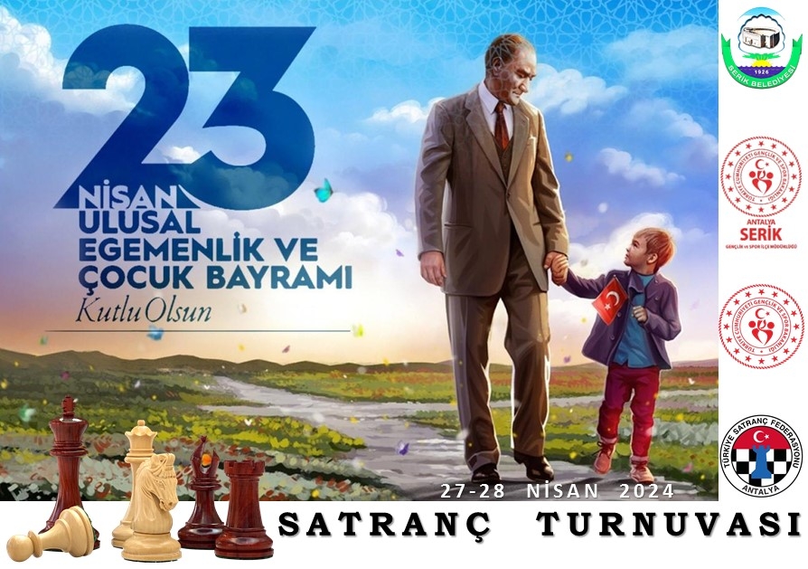 23 Nisan Ulusal Egemenlik ve Çocuk Bayramı kutlamaları etkinliklerinde Serik Belediyesi Toplantı Salonu'nda Satranç Turnuvası düzenlenecektir.