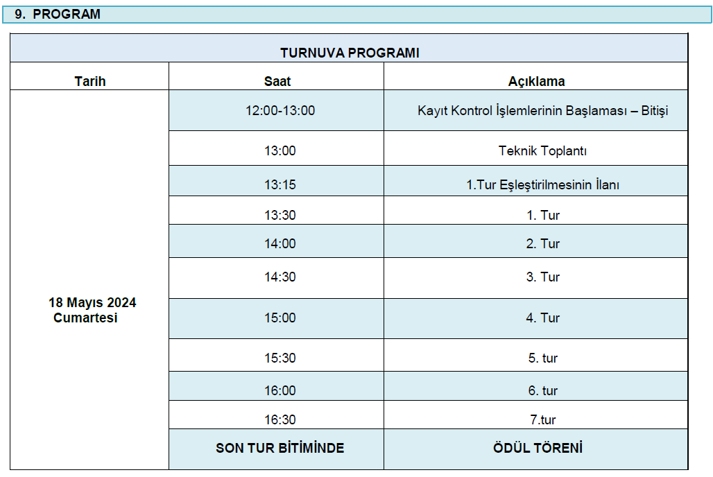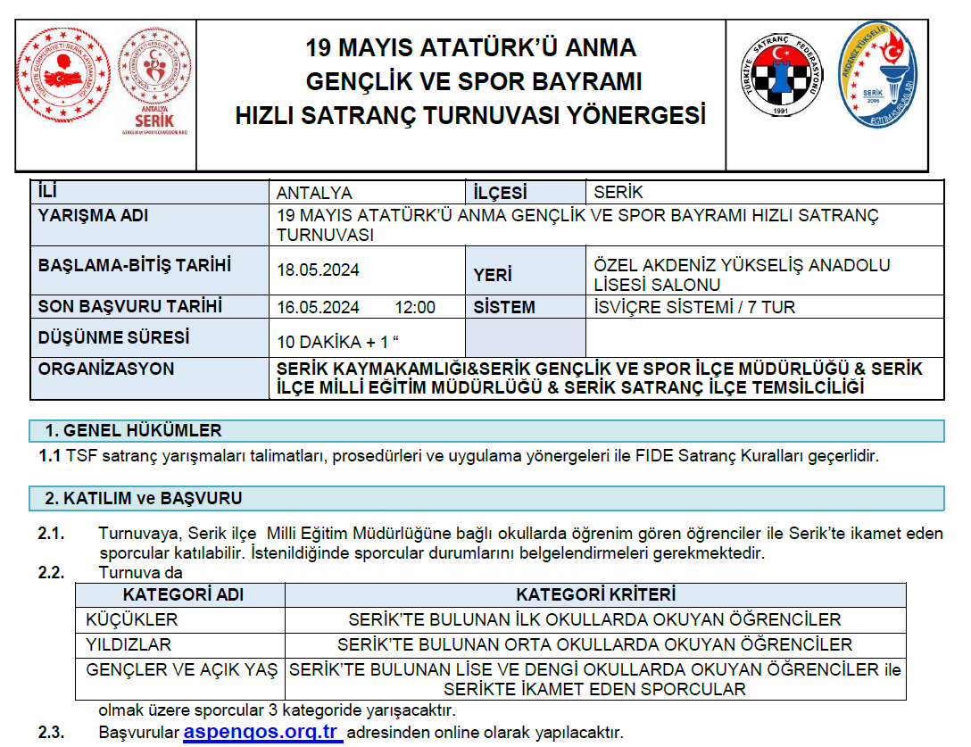 19 Mayıs Atatürk'ü Anma Gençlik ve Spor Bayramı Hızlı Satranç Turnuvası 18 Mart 2024 tarihinde 3 kategoride (İlkokullar-Ortaokullar-Lise ve Açık Yaş) Serik Özel Akdeniz Yükseliş Fen/Anadolu Lisesi'nde yapılacaktır. Katılım ve başvuru şartları için yazının devamına tıklayın.